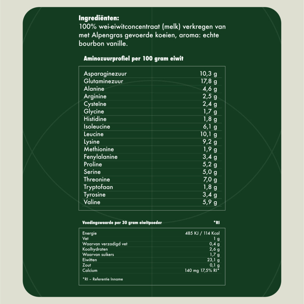 Ingrediënten: Wei-eiwitconcentraat (melk) verkregen van met Alpengras gevoerde koeien, aroma: echte bourbon vanille.
