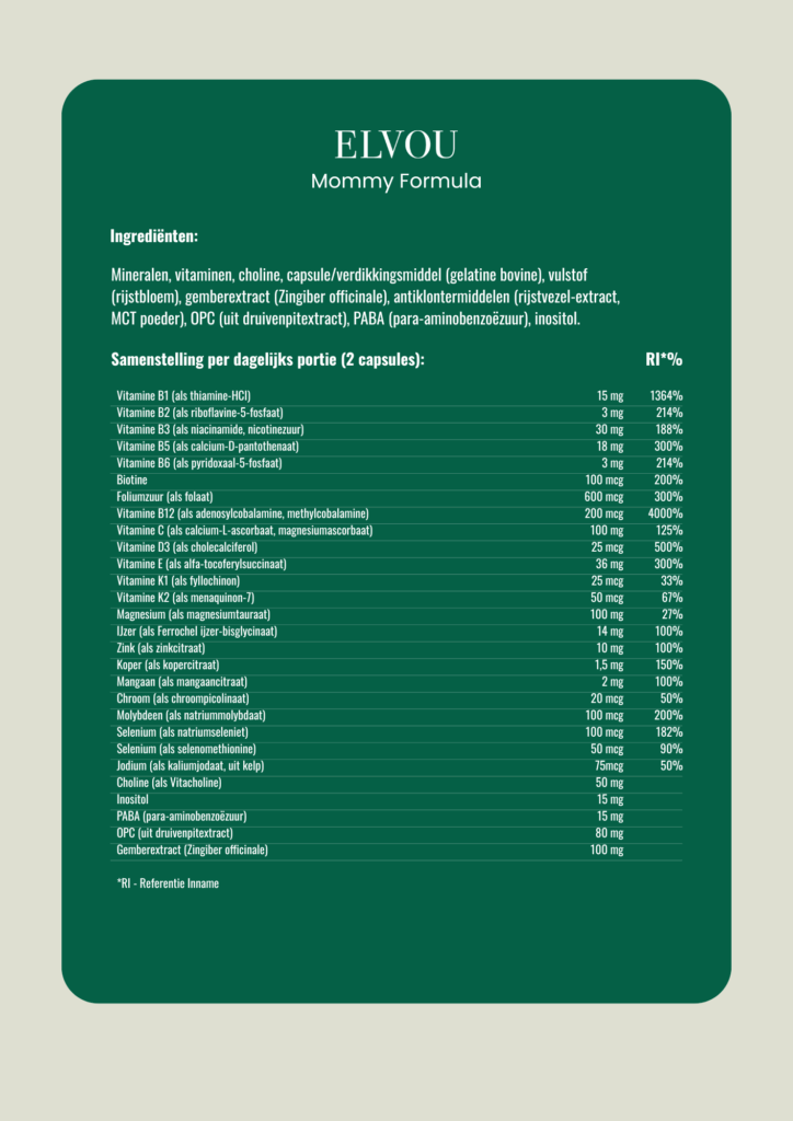 Ook vitamine D is een belangrijke vitamine tijdens de zwangerschap. Het ondersteunt de werking van het immuunsysteem en speelt een rol bij de botaanmaak van kinderen. Omdat de behoefte aan vitamine D in deze periode verhoogd is, is het advies voor zwangere vrouwen om dagelijks extra vitamine D te nemen. Deze formule bevat 25 mcg vitamine D3 per dagdosering, waarmee een aanvullende inname overbodig is.