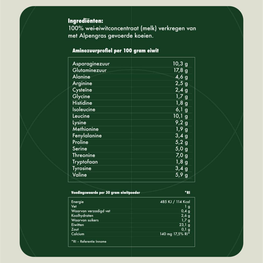 Ingrediënten: 100% wei-eiwitconcentraat (melk) verkregen van met Alpengras gevoerde koeien.
